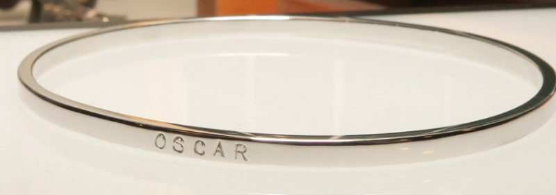 Ibland är det enklaste faktiskt det vackraste. Här en slät armring i vitguld med instansade bokstäver,och än en gång. Grattis till bebisen.