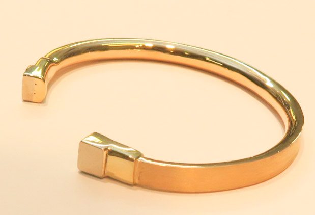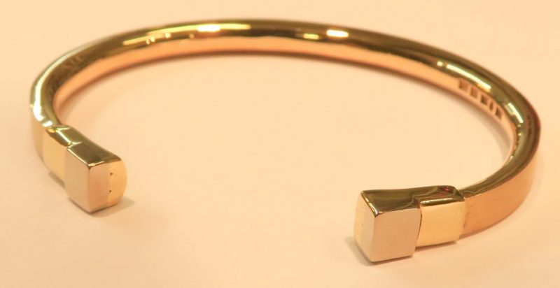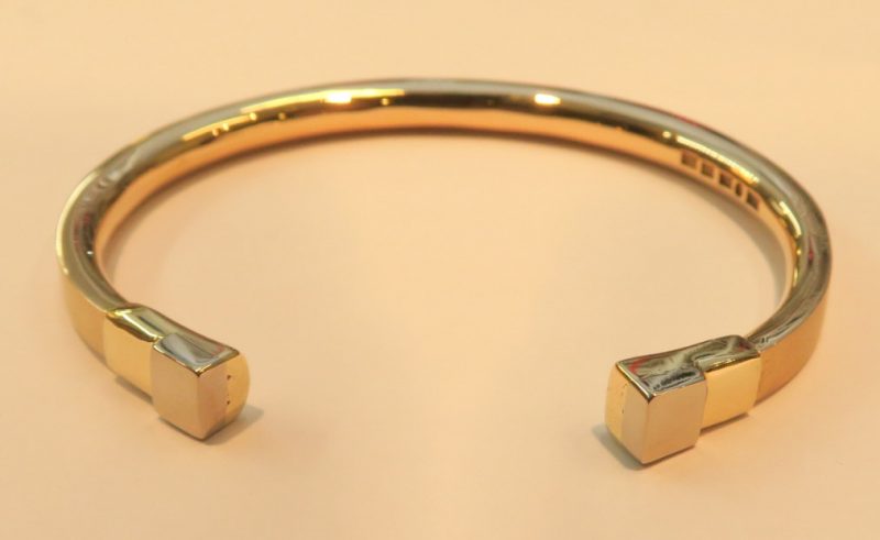 Här har vi gjort en armring i 18karats guld till en man. I avsluten har vi tagit hans anförvanters gamla ringar och brutit den ursprungliga formen.