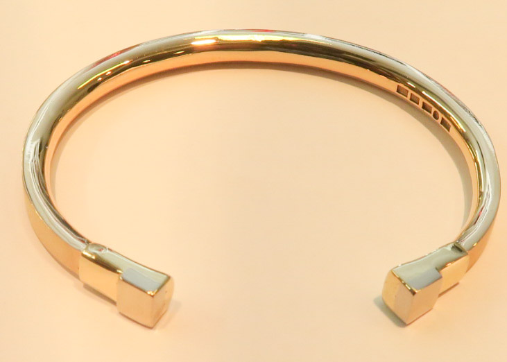 Här kommer en armringsvariant som är Lite annorlunda. Rödguld och vitguld är sammantvinnat till två armringar som hålls ihop av en ögla ,även den i bägge färgerna.